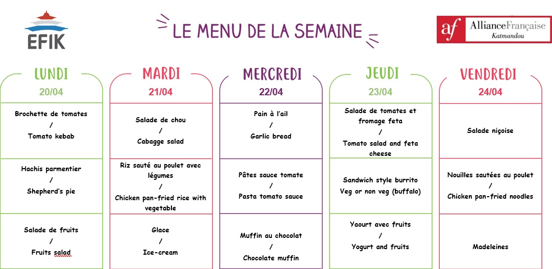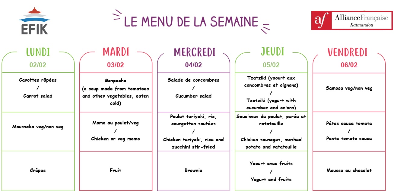 Grâce à notre collaboration avec l’Alliance Française, nous pouvons fournir aux familles qui le souhaitent, dans notre cantine, des repas variés, équilibrés et de bonne qualité permettant d’adopter des habitudes alimentaires saines.